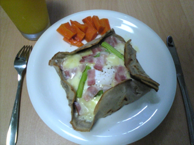 そば粉のガレット、にんじんのバターソテー、オレンジジュースです。