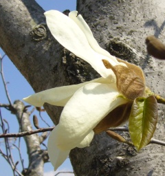 コブシは花の付け根に若い葉がでている。